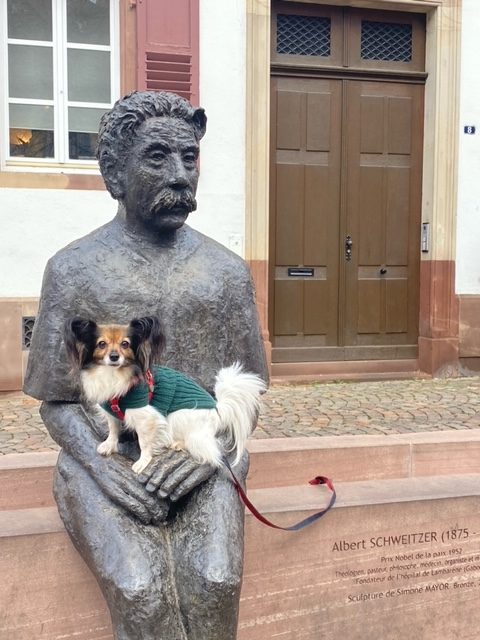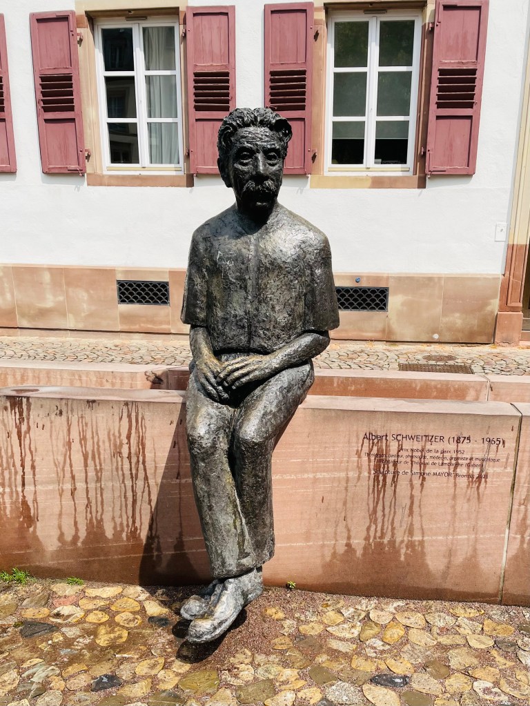 I discuss statues and monuments frequently in my talks and one of my new favorites can be found at Place Saint-Thomas in Strasbourg. The bronze statue of the Nobel laureate Albert Schweitzer (1875-1965) is the work of Simone Mayor (2021) and depicts the famed Alsatian pastor, theologian, doctor and musician seated upon a sandstone wall that runs beside the St. Thomas Church. It is a humble portrayal of the 1952 Noble Prize winner for his “Reverence for Life” philosophy.