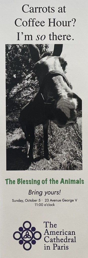 We visited several churches during our time in Paris, but two cathedrals stood out. During our two visits to attend Sunday services at the American Cathedral in Paris we first 1) heard about the upcoming “blessing of the animals” for the feast of St. Francis and then 2) participated in the service when the blessing—for more than 100 dogs and cats (and perhaps some other pets we missed)—took place in the middle of this beautiful cathedral. It was a treat!