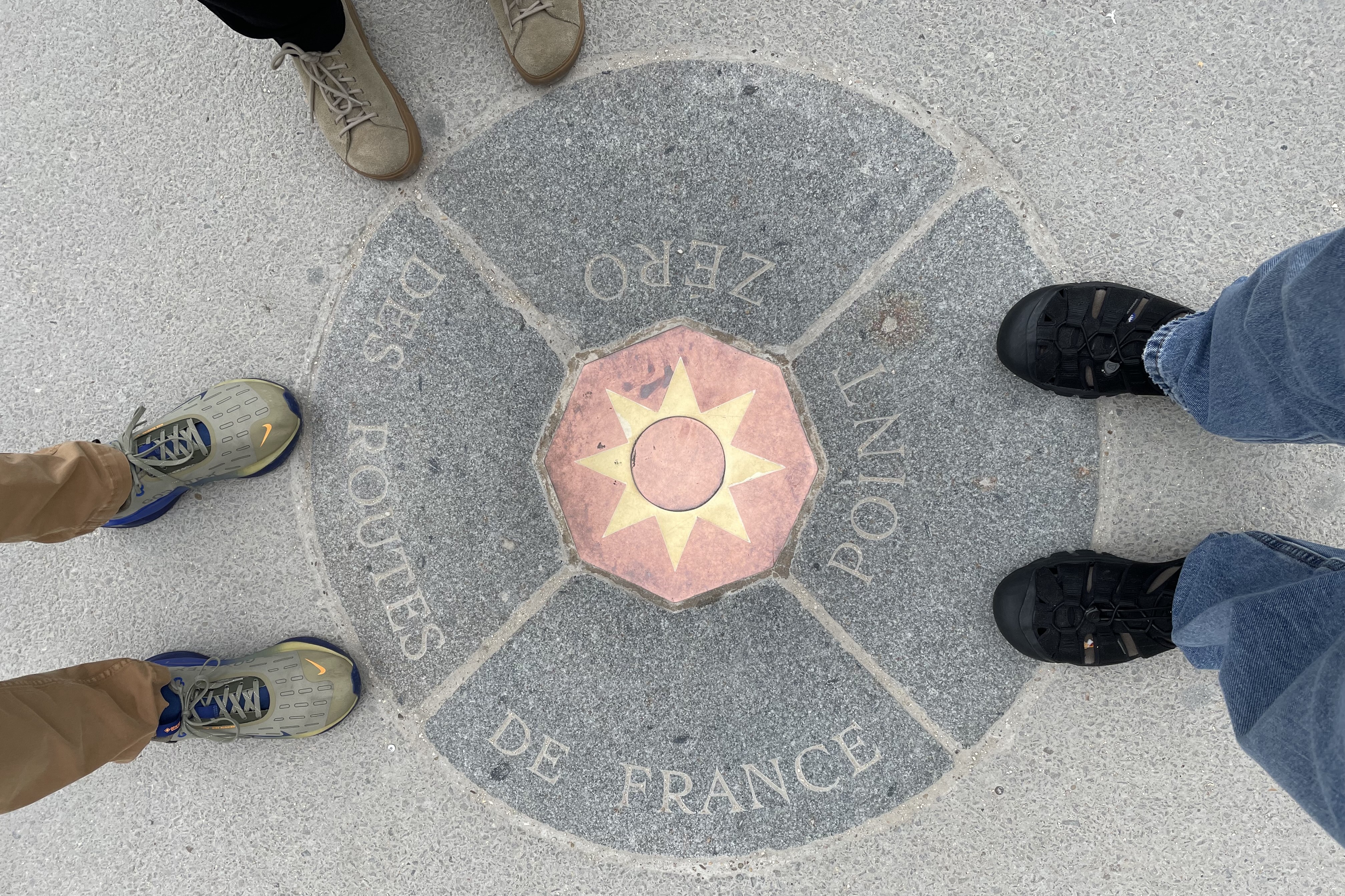 I’ll end with two photos. While Claire had already flown home, Andrew, Candice, and I (at least our feet) are seen at the Point Zero marker in front of Notre-Dame. This small and obscure plaque is the official starting point for measuring distances in France, and every road in the country is connected to this spot. When you see a road sign saying, for example, “Paris 200 km,” the distance is measured from this plaque.