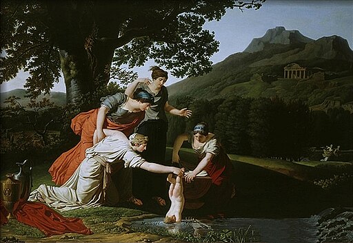 Artwork depicting Thetis as she dips her son Achilles into the River Styx in the hopes of making him immortal by Antoine Borel, Public domain, via Wikimedia Commons