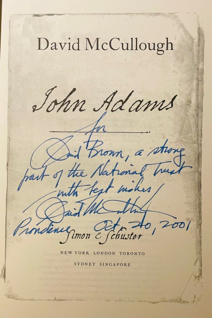 That day, in a room behind the sanctuary of The First Baptist Church in America, we discussed the Brooklyn Bridge as well as his recent study of John Adams. David offered to sign a copy of the former for my father and the latter for me, a generous gift I will always treasure.