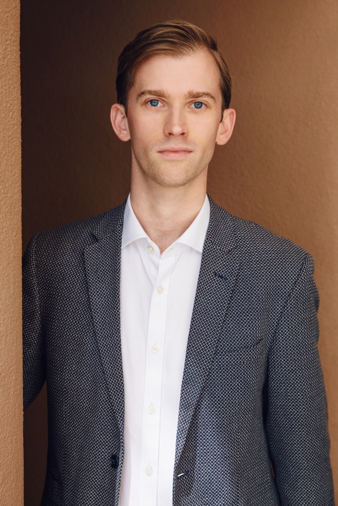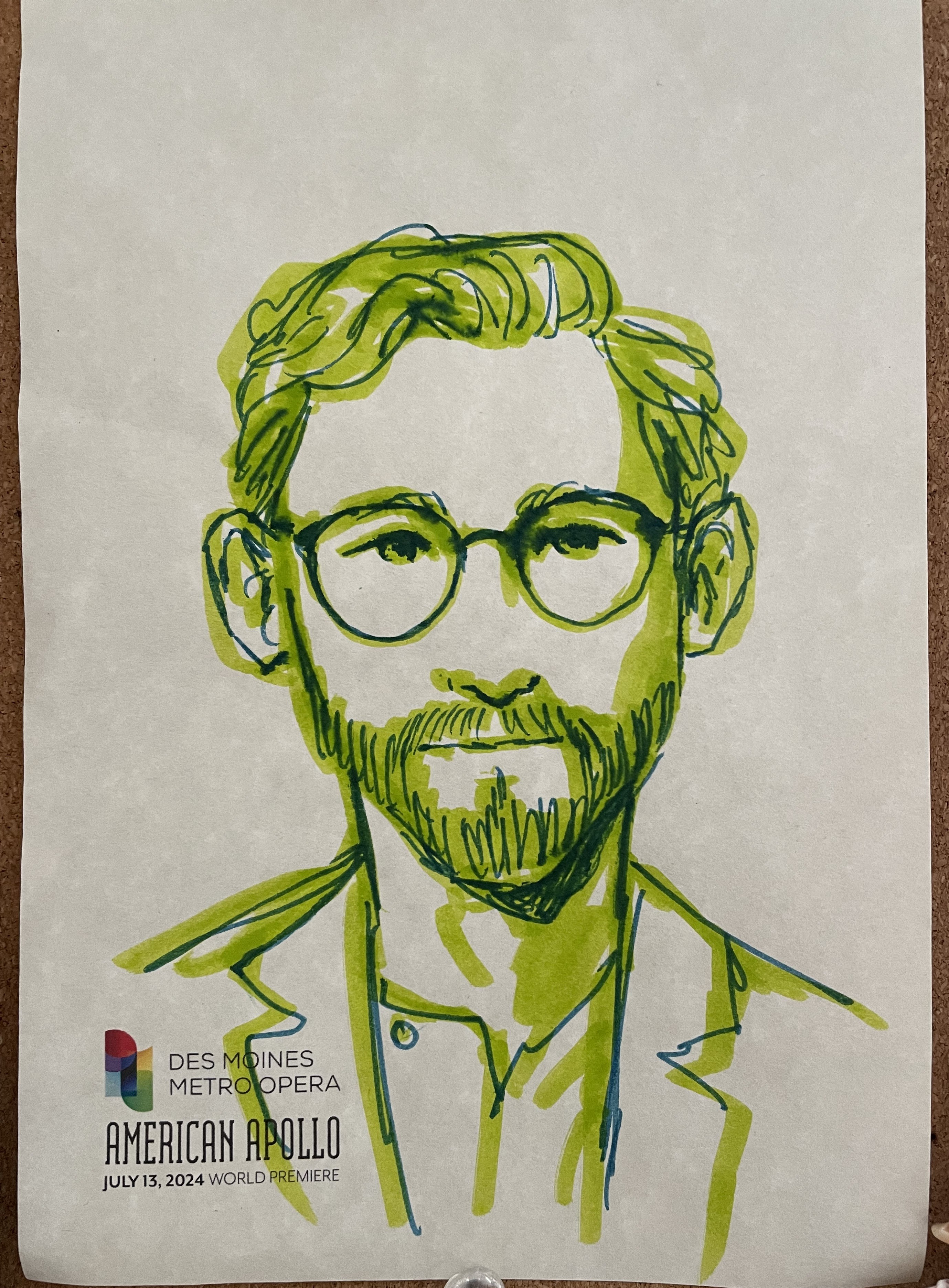 The drawing of Andrew is from his covering the role of John Singer Sargent in last year’s premier of American Apollo at Des Moines Metro Opera, and the photo is his new professional headshot taken this summer at the Santa Fe Opera, where he was an Apprentice Artist.