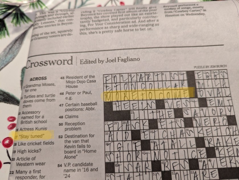 Each year when the family gathers we usually pull out jigsaw puzzles and other games. As we lounged at the morning breakfast table in late December (the 27th to be exact), Andrew—one of our main puzzle enthusiasts—discovered that MORE TO COME made the New York Times Crossword Puzzle! How cool is that!! (I’m pretty sure this newsletter was what the puzzle master had in mind.)