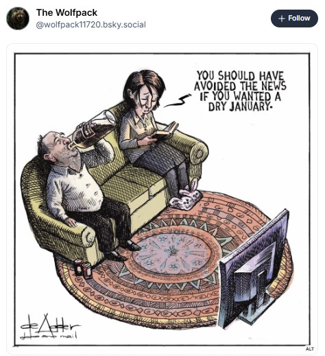 It can appear that the world—or at least our country—has lost its mind. The brilliant Canadian cartoonist Michael de Adder* recently posted a new work that spoke volumes. As a man clearly three-sheets-to-the-wind downs a liter of booze, his wife observes: “You should have avoided the news if you wanted a Dry January.”