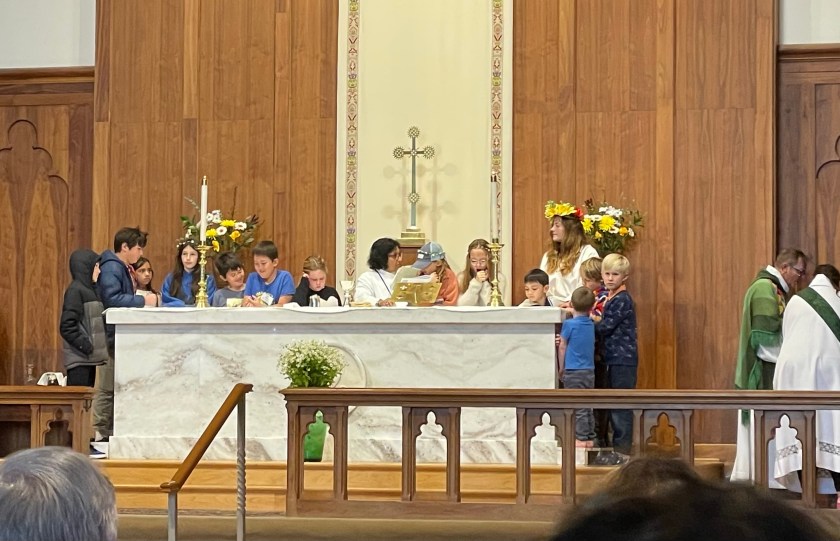 The children’s sermon focused on the saint’s many miracles (the adults seemed to especially enjoy the turning a bathtub of water into beer) and on her kindness for all people and animals. Brigid is a patron saint of Ireland, dairymaids, cattle, midwives, Irish nuns, and newborn babies. The children joined St. Brigid around the altar, making for a festive eucharist.