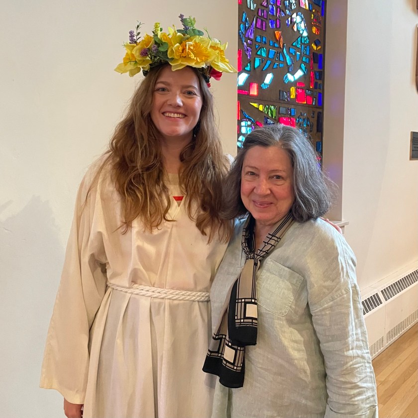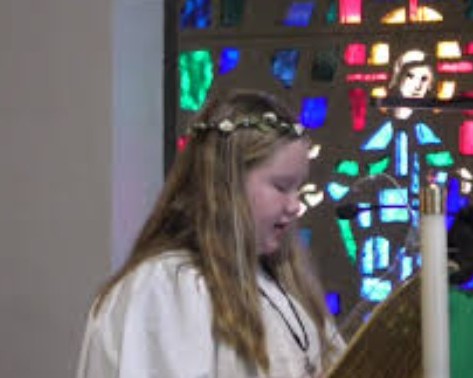 Christ Church celebrates by welcoming the saint (a role performed by our daughter the last three years) who arrives with a crown of flowers. The young women of the parish also wear flowered wreaths in their hair.