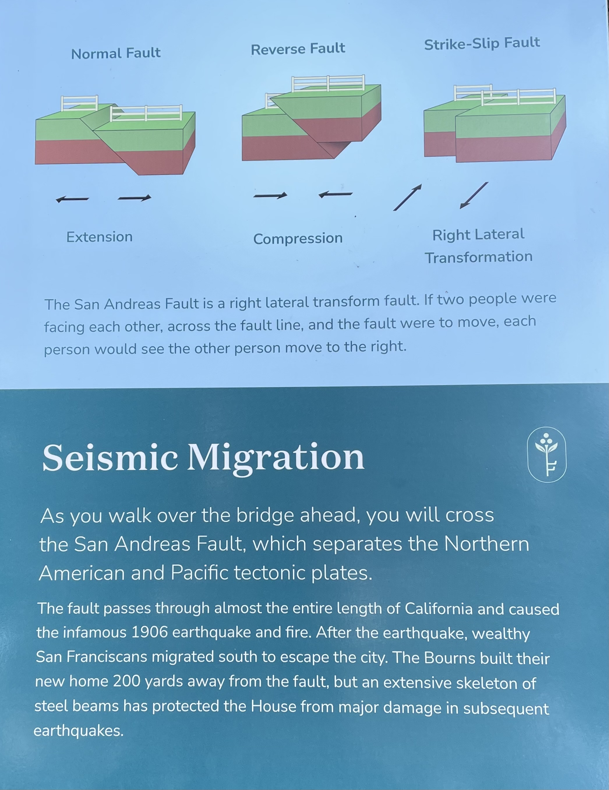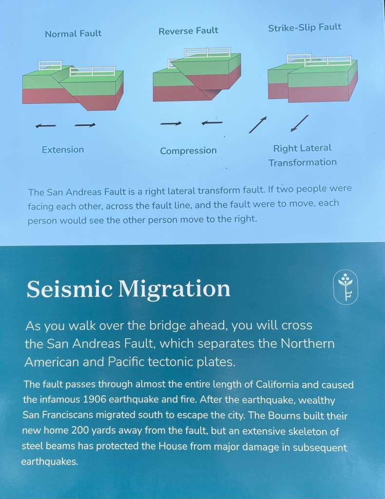 One of the features of the landscape visitors can experience at Filoli is the chance to walk across the San Andreas Fault which separates the Northern American and Pacific tectonic plates. Really! The shift in this fault line was the cause of the famous 1906 San Francisco earthquake. It is a reminder of the fragile nature of our earth, one of several places on the site that call one to stop for reflection. And our visit on Saturday wouldn’t be the last experience we had with seismic shifts in the Golden State.