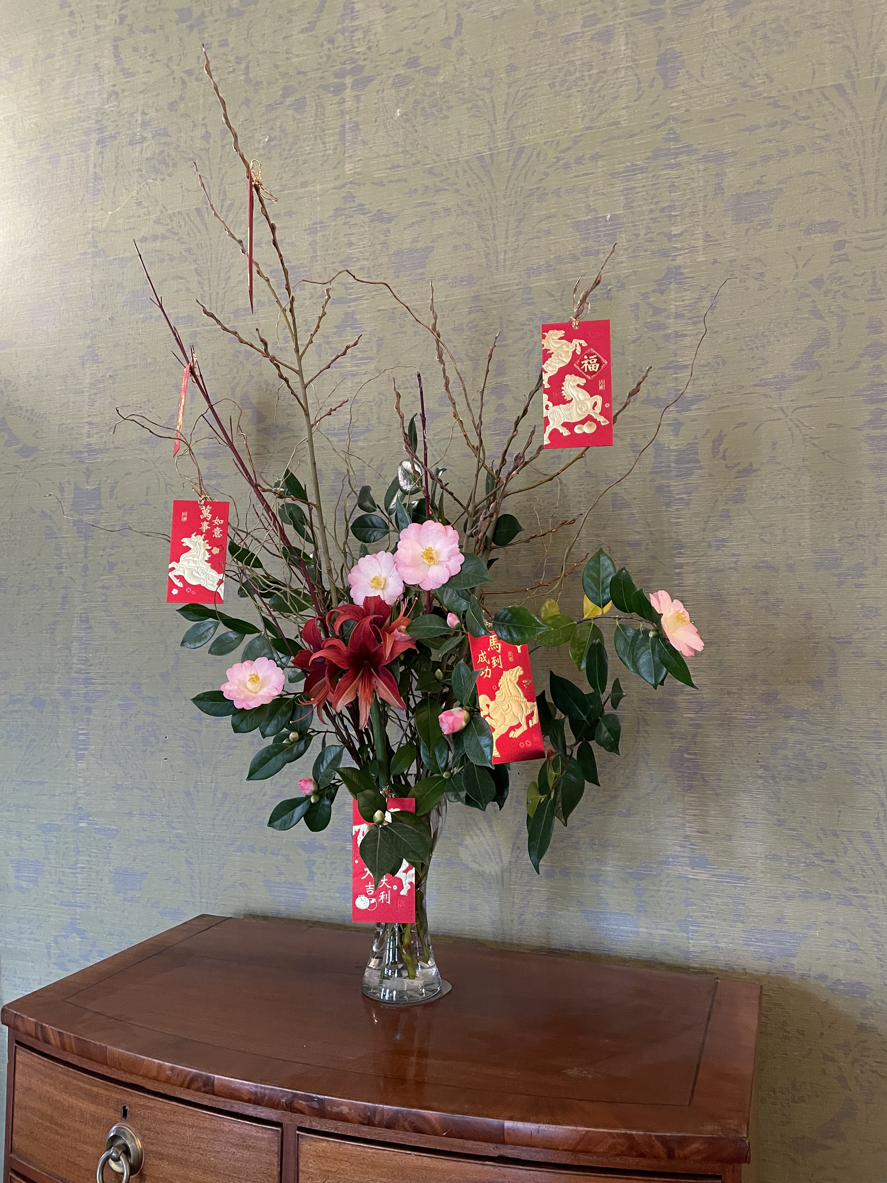 The house was being prepared for the upcoming celebration of the Lunar New Year. The Year of the Horse begins on February 17th, and the displays, including the Chinese porcelains, were embracing the theme.