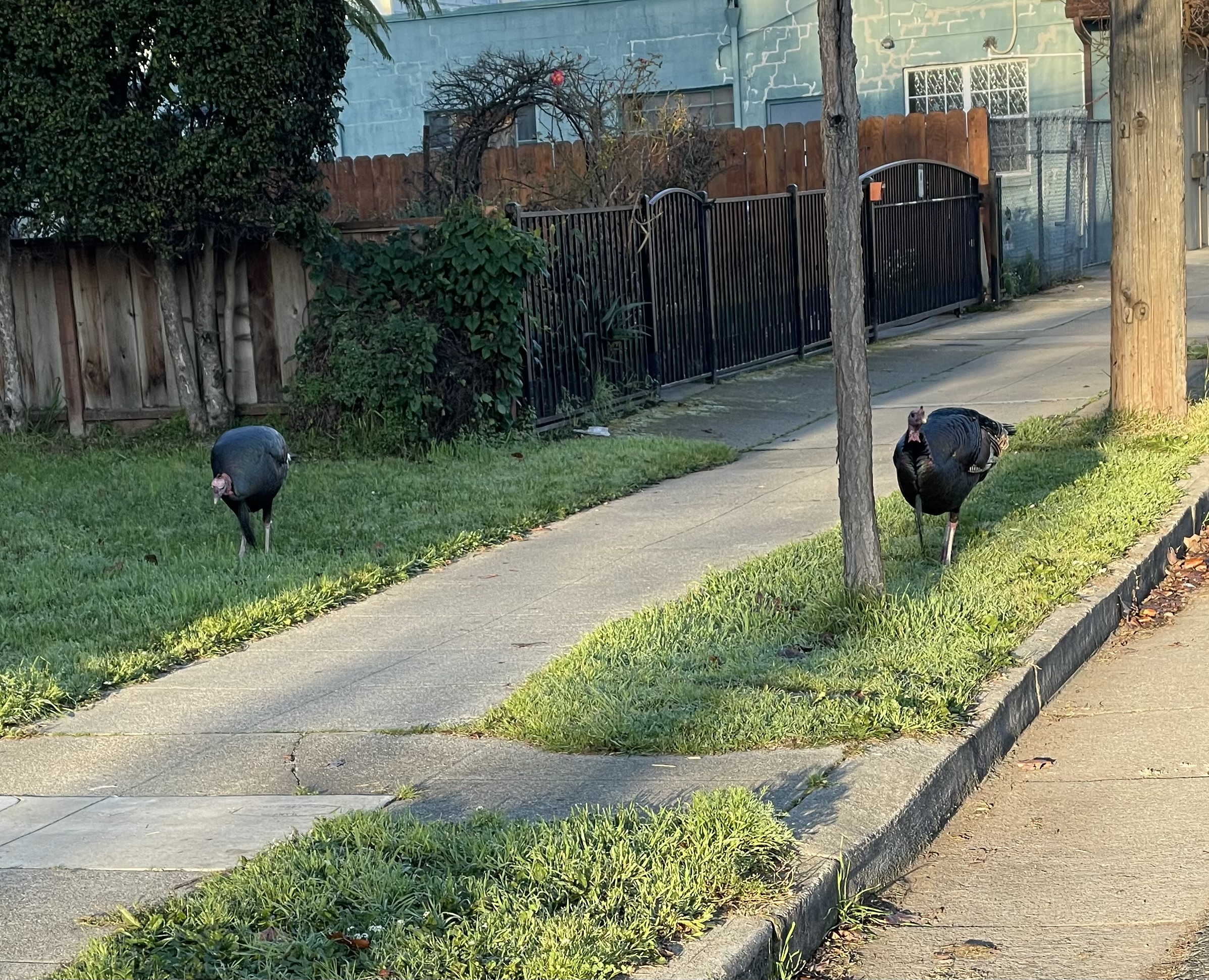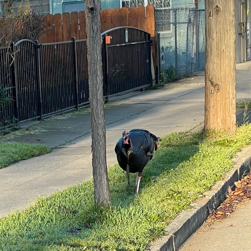 We had been warned that Alameda had a flock of wild turkeys, and we actually saw three saunter (that’s the only word for it) across a busy street holding up traffic the day before. But here were two, big as life, blocking my path.