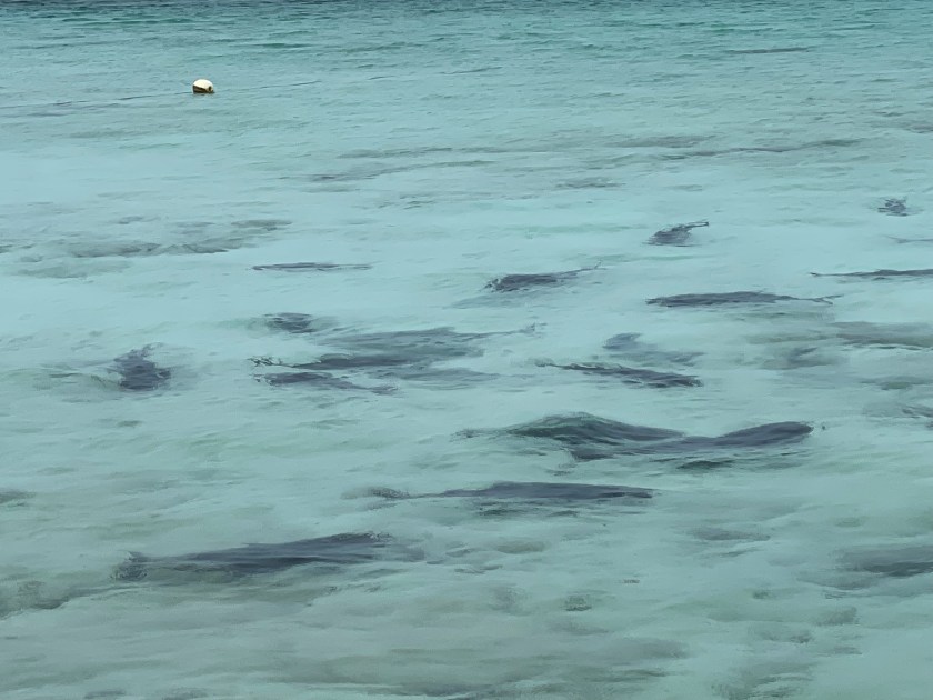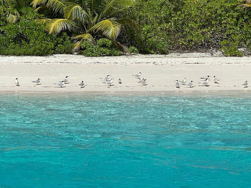 Farquhar Atoll was especially fascinating. In the Seychelles, half a million terns nest on islands such as this. “Fledglings must eventually take to the wing, but danger lurks beneath the waves, where giant trevally fish leap clear out of the water to snatch the birds.” We saw the fish swimming just off shore, but the birds were staying clear of the area while we visited.