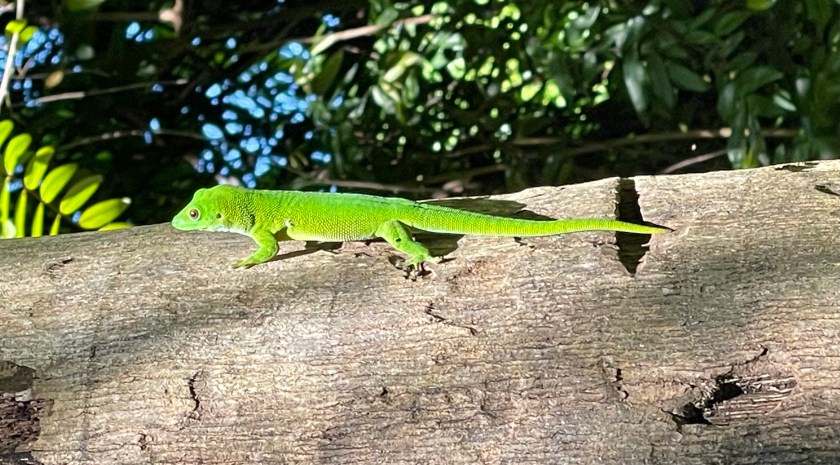 There are no poisonous snakes on Madagascar, but boa constrictors are natural predators that lemurs must avoid if they want to keep leaping from tree to tree. We saw a few boas sunning themselves on this warm day, just waiting for their chance for a meal. Oh, and those of us who watch too much sports on television may be excused for thinking geckos live only in Geico insurance commercials, but they were certainly present in Nosy Komba.